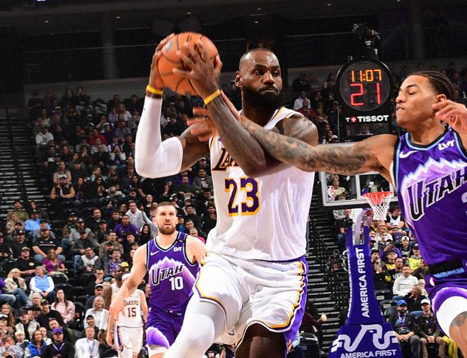 詹姆斯快攻扣篮止血后,翻身后仰跳投再中,此后反击一条龙上篮!中段两队陷入拉锯战,直到节末八村塁三分球打破僵局,半场湖人62-55爵士。湖人记者确认,艾顿因右膝挫伤回归成疑。第三节海斯顶替首发,乔治追着老詹扔三分球,米哈伊柳克也续上三分,爵士很快反超。湖人进攻哑火,里夫斯单打杯水车薪,后半段老詹下场后,东契奇和里夫斯单打抹平分差,詹姆斯接球抡扣,三节打完,湖人84-81爵士。第四节老詹快攻继续拉杆上篮,随后成功单防米哈伊柳克。